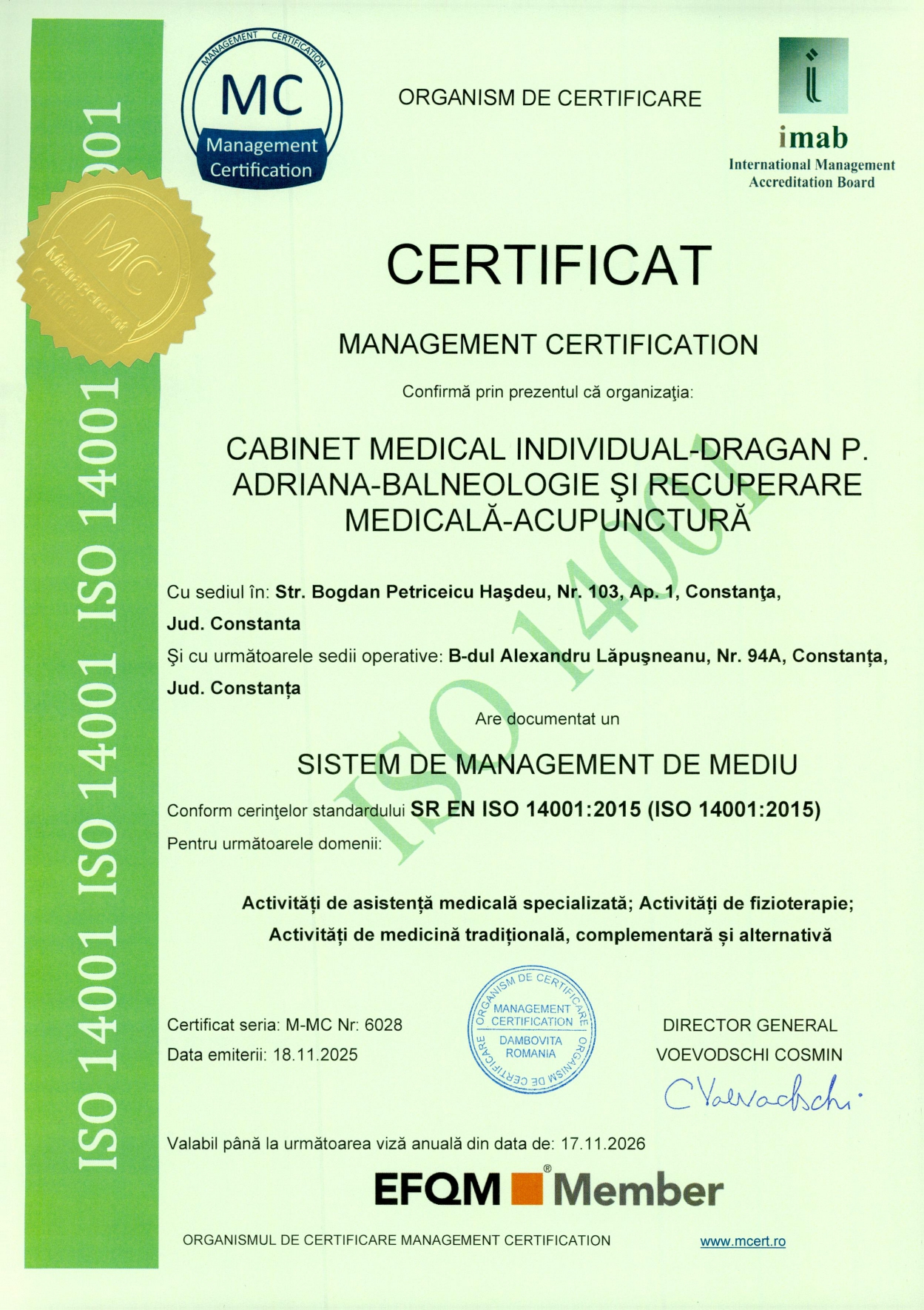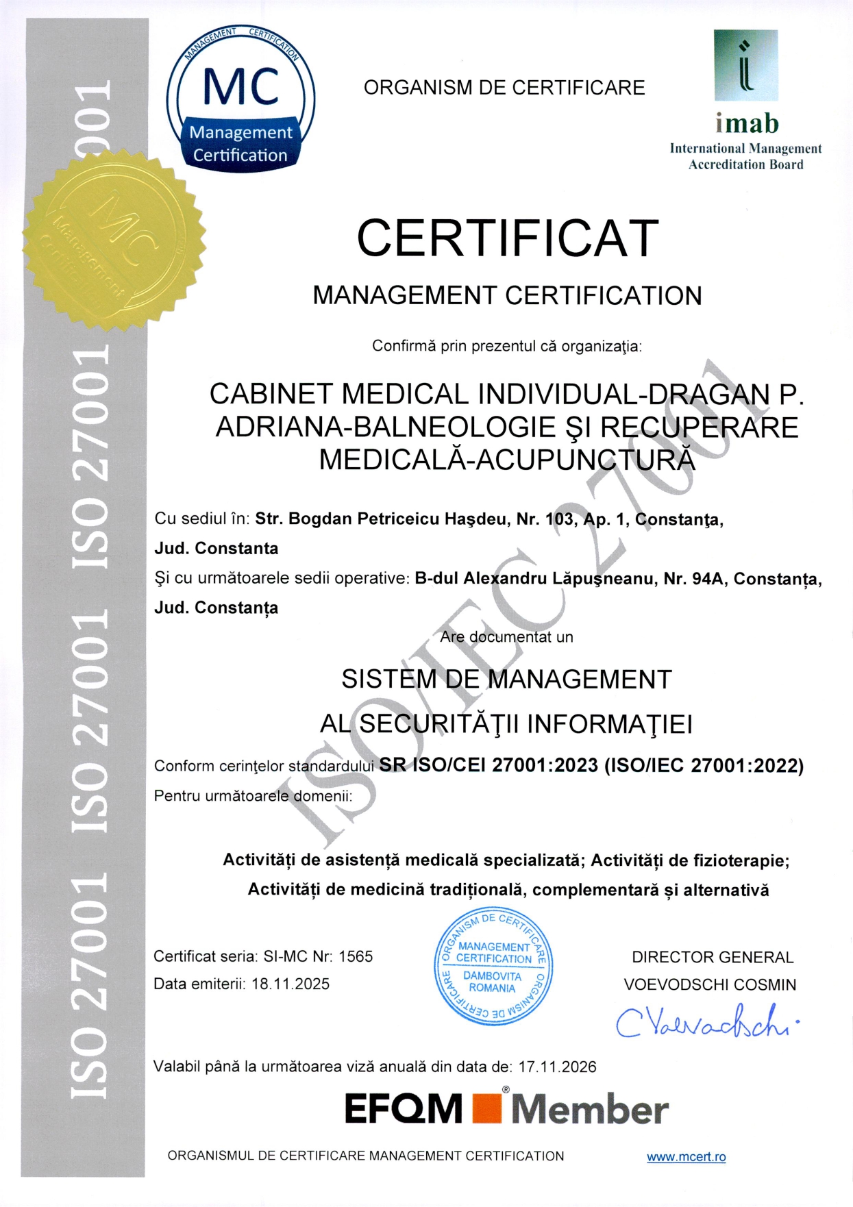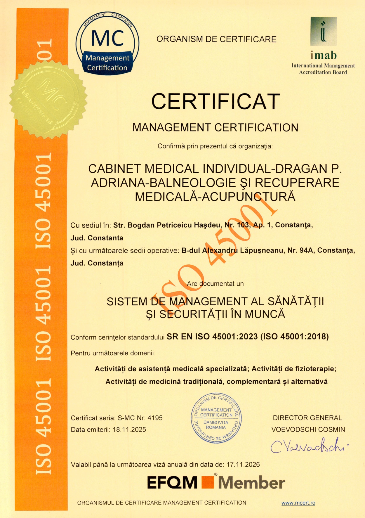 Pentru a garanta calitatea actului medical și siguranța pacienților, clinica noastră este certificată conform celor mai importante standarde internaționale: ISO 9001 (managementul calității), ISO 27001 (securitatea informațiilor), ISO 45001 (sănătate și securitate ocupațională) și ISO 14001 (management de mediu).