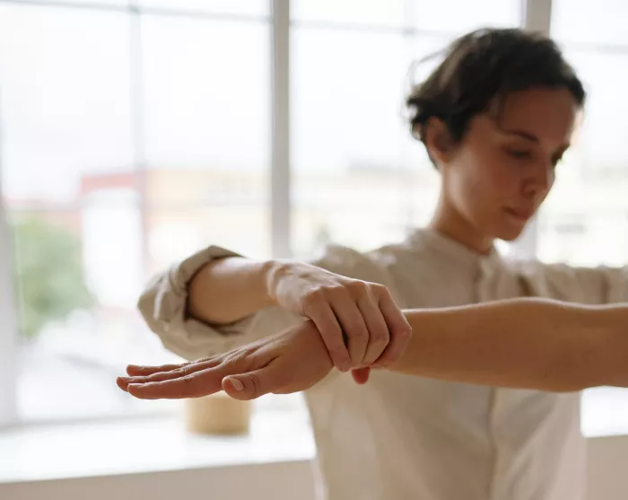 - Întinde palma în față, cu degetele spre tavan, și trage ușor de ea cu cealaltă mână (stretching pentru flexori);